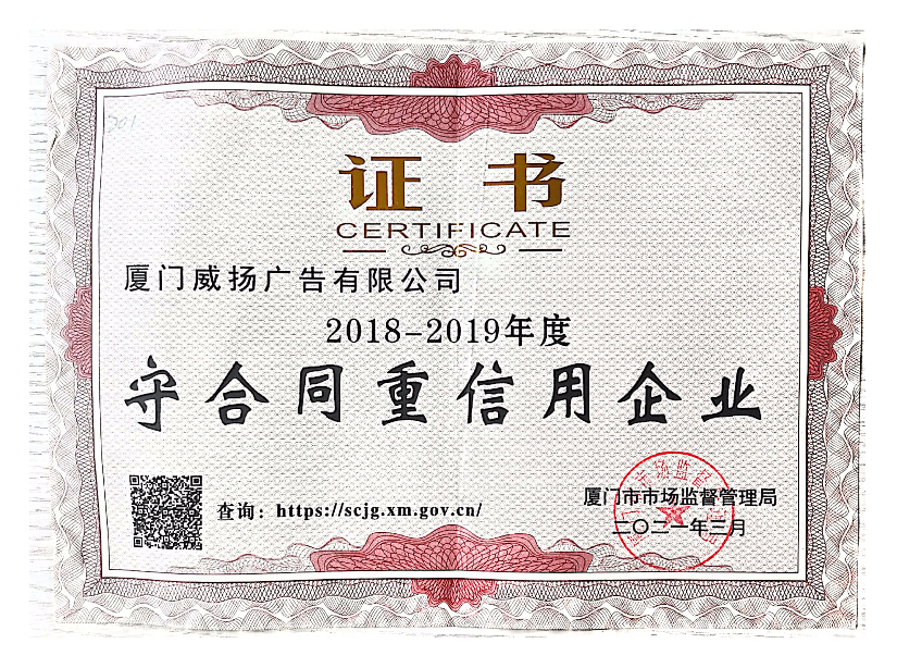 2018-2019年度廈門市守合同重信用企業(yè)